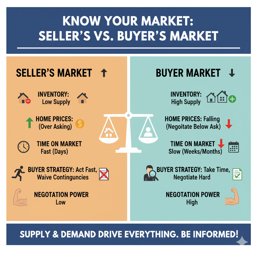 - Buyer Strategy: In a Seller's Market, you need to act fast, waive contingencies, and offer high. In a Buyer's Market, you should take your time, negotiate hard, and demand contingencies.