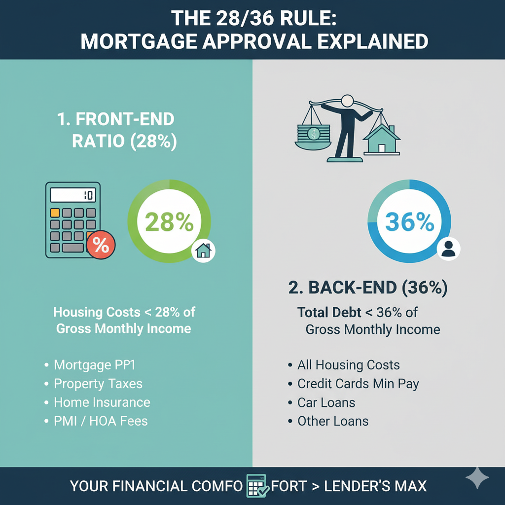 Mortgage lenders use a standard guideline known as the 28/36 Rule to determine how much they’re willing to lend you. This rule is based on your gross monthly income (your income before taxes and deductions). The Front-End Ratio (28%) This part of the rule states that your total monthly housing expenses should not exceed 28% of your gross monthly income.